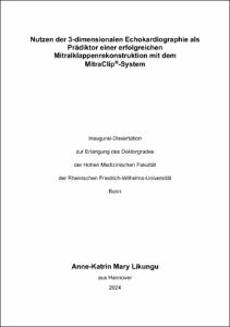 Likungu, Anne-Katrin Mary: Nutzen der 3-dimensionalen Echokardiographie als Prädiktor einer erfolgreichen Mitralklappenrekonstruktion mit dem MitraClip®-System. - Bonn, 2024. - Dissertation, Rheinische Friedrich-Wilhelms-Universität Bonn.