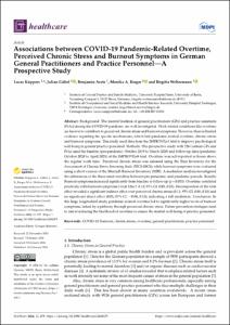 Küppers, Lucas; Göbel, Julian; Aretz, Benjamin; Rieger, Monika A.; Weltermann, Birgitta: Associations between COVID-19 Pandemic-Related Overtime, Perceived Chronic Stress and Burnout Symptoms in German General Practitioners and Practice Personnel : A Prospective Study. In: Healthcare. 2024, vol. 12, iss. 4, 479, 1-15.
