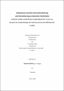 Göller, Susanne: Diskrepanzen zwischen Internationalisierung und Internalisierung an deutschen Hochschulen : Implizite Hürden ausländischer Studienbewerber*innen am Beispiel des Studienkollegs der Fachhochschule des Mittelstands in NRW. - Bonn, 2025. - Dissertation, Rheinische Friedrich-Wilhelms-Universität Bonn.