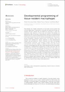 note = {Macrophages are integral components of the innate immune system that colonize organs early in development and persist into adulthood through self-renewal. Their fate, whether they are replaced by monocytes or retain their embryonic origin, depends on tissue type and integrity. Macrophages are influenced by their environment, a phenomenon referred to as developmental programming. This influence extends beyond the local tissue microenvironment and includes soluble factors that can reach the macrophage niche. These factors include metabolites, antibodies, growth factors, and cytokines, which may originate from maternal diet, lifestyle, infections, or other developmental triggers and perturbations. These influences can alter macrophage transcriptional, epigenetic, and metabolic profiles, affecting cell-cell communication and tissue integrity. In addition to their crucial role in tissue immunity, macrophages play vital roles in tissue development and homeostasis. Consequently, developmental programming of these long-lived cells can modulate tissue physiology and pathology throughout life. In this review, we discuss the ontogeny of macrophages, the necessity of developmental programming by the niche for macrophage identity and function, and how developmental perturbations can affect the programming of macrophages and their subtissular niches, thereby influencing disease onset and progression in adulthood. Understanding these effects can inform targeted interventions or preventive strategies against diseases. Finally, understanding the consequences of developmental programming will shed light on how maternal health and disease may impact the well-being of future generations.},