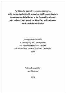 Brockmöller, Tobias: Funktionelle Magnetresonanztomographie, elektrophysiologisches Hirnmapping und Neuronavigation : Anwendungsmöglichkeiten in der Neurochirurgie vor, während und nach operativen Eingriffen im Bereich des sensomotorischen Cortex. - Bonn, 2010. - Dissertation, Rheinische Friedrich-Wilhelms-Universität Bonn.