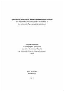 Hansmeier, Britta: Diagnostische Möglichkeiten rekonstruierter Panoramaaufnahmen aus digitalen Volumentomographien im Vergleich zu konventionellen Panoramaschichtaufnahmen. - Bonn, 2012. - Dissertation, Rheinische Friedrich-Wilhelms-Universität Bonn.