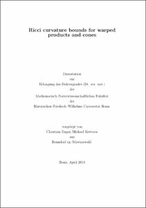 Ketterer, Christian Eugen Michael: Ricci curvature bounds for warped products and cones. - Bonn, 2014. - Dissertation, Rheinische Friedrich-Wilhelms-Universität Bonn.
